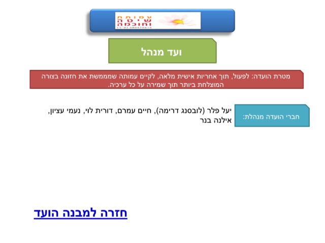 להנמ דעו הרוצב הנוזח תא תשמממש התומע םייקל , האלמ תישיא תוירחא ךות , לועפל : הדעוה תרטמ . היכרע לכ לע הרימש ךות רתויב תחלצומה , ןויצע ימענ , יול תירוד , םרמע םייח ) , המירד גנסבול ( רלפ לעי רנב הנליא : תלהנמ הדעוה ירבח